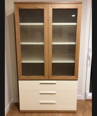 - Vitrina modelo TAL0015, de estilo moderno hecha a medida, en madera de castaño en color madera con los frentes blancos, con dos puertas vitrina y tres cajones abajo