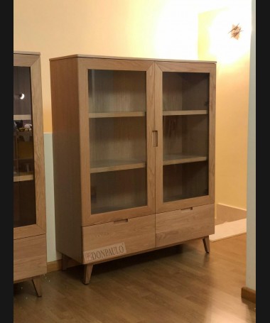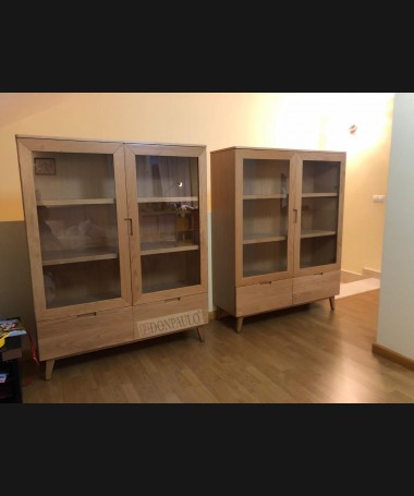 - Vitrina modelo TAL0020, de estilo moderno hecho a medida, en madera en color natural, con cajones y puertas cristaleras