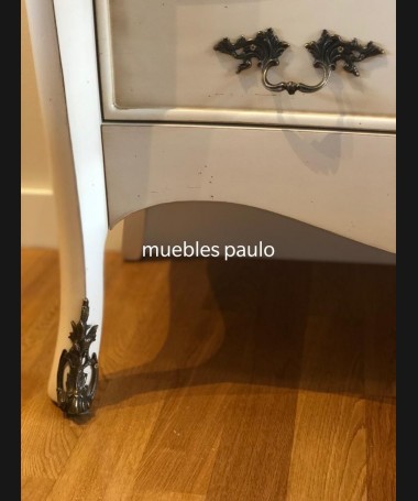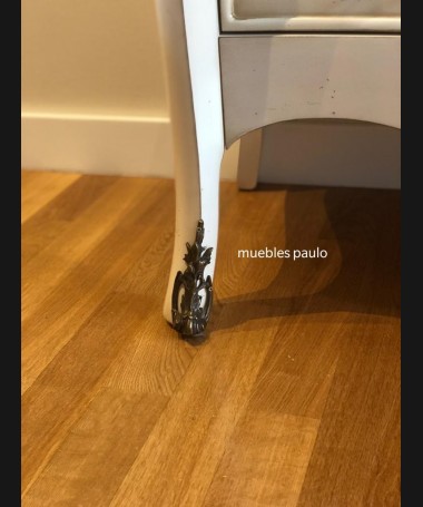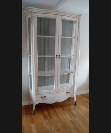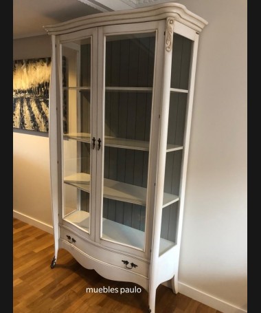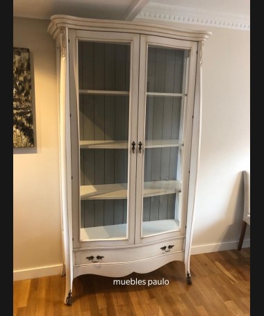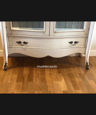- Vitrina modelo TAL0033, de estilo clásico hecho a medida, en madera de cerezo en acabado efecto anticuario blanco roto con detalles grises. Con puertas de cristal y un cajón