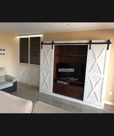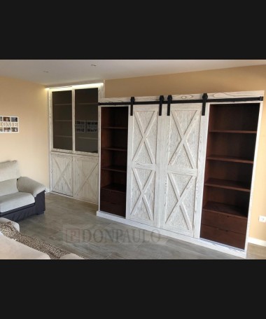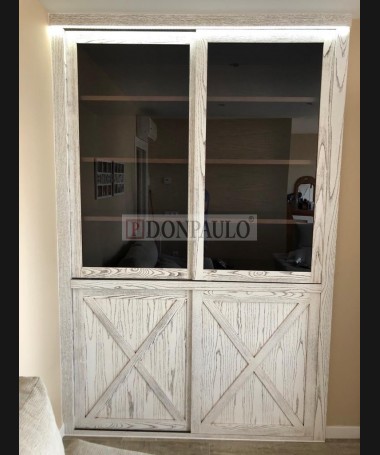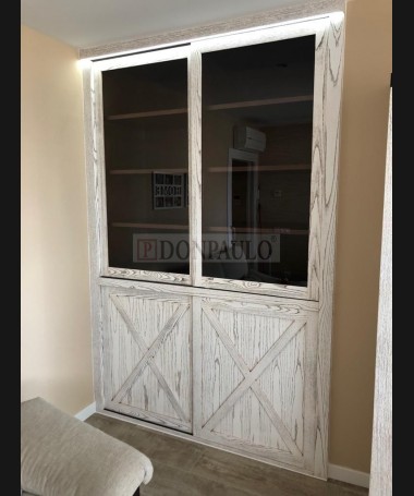 - Vitrina modelo TAL0009, en madera de castaño, en acabado decapado blanco con la beta marrón, y el interior en color tabaco, hecha a medida, con la parte de arriba con luz led