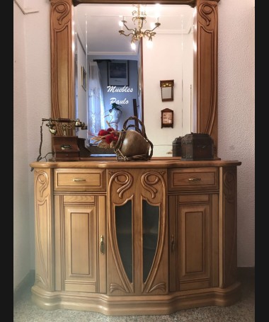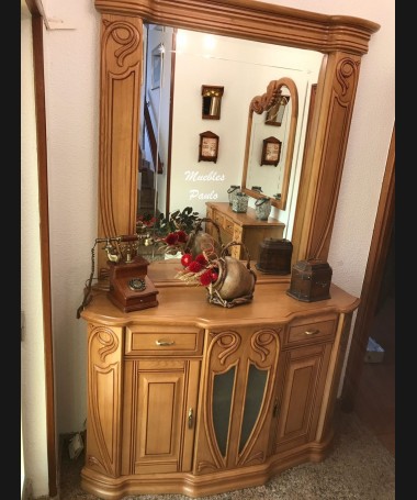 - Consola con espejo modelo Laço TAP0030, de estilo clásico hecha a medida, en madera maciza de castaño tallada, con dos cajones. Y aparador con espejo a medida