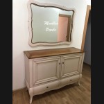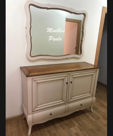 - Aparador modelo TAP0033, de estilo clásico hecho a medida, en madera de cerezo, en acabado efecto anticuario en blanco roto con la tapa de madera. Con dos puertas y dos cajones. Espejo a juego