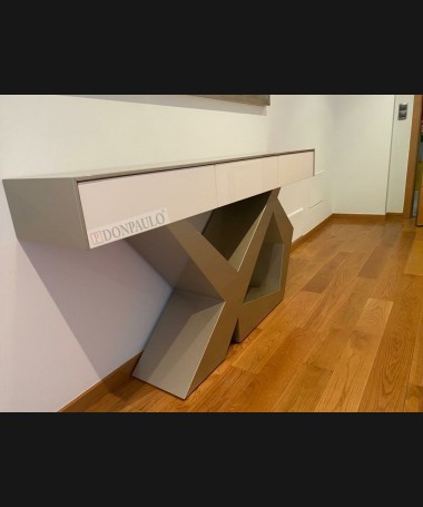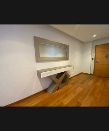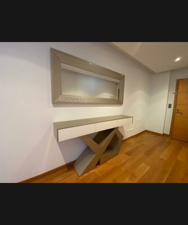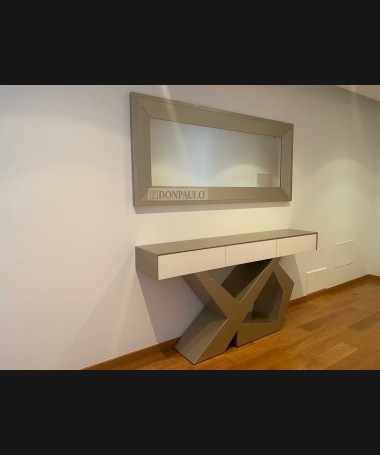 - Consola modelo TAP0035, de estilo moderno hecha a medida, en DM hidrófugo lacado en blanco y gris, con dos cajones; y espejo a juego
