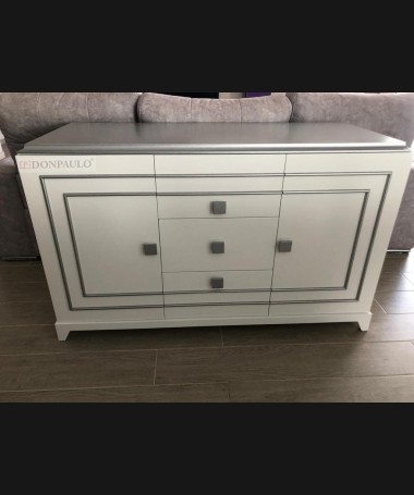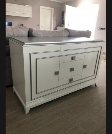 - Aparador modelo TAP0041, de estilo moderno hecho a medida, en lacado blanco mate con detalles plateados, con puertas y cajones