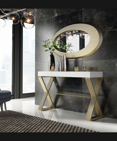- Consola modelo PAP0040, de estilo moderno hecha a medida, en DM hidrofugo lacada en blanco y dorado mate, con un cajón, y con espejo a juego