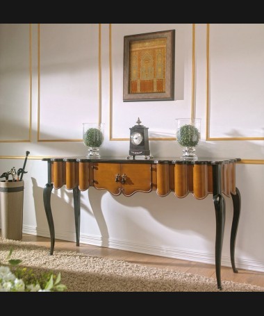- Consola modelo PAP0057, de estilo clásico hecho a medida, en madera de cerezo, en acabado efecto anticuario en dos tonos, con dos puertitas pequeñas