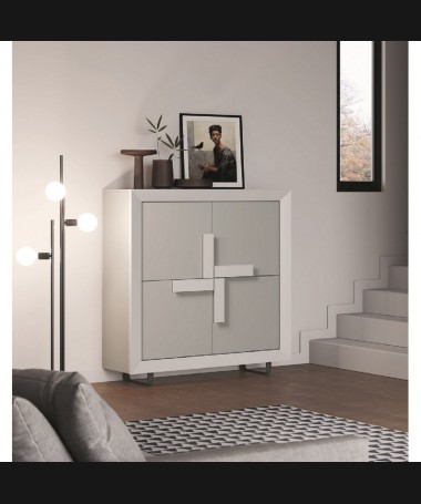 - Zapatero modelo PAP0060, de estilo moderno hecho a medida, en lacado blanco mate con los frentes grises, con 4 puertas, y patas metálicas altas