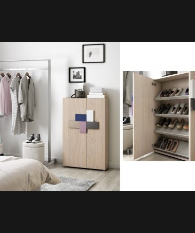 - Zapatero modelo PAP0066, de estilo moderno hecho a medida, en melamina color madera con detalles de colores. De dos puertas, con baldas inclinadas dentro para colocar zapatos