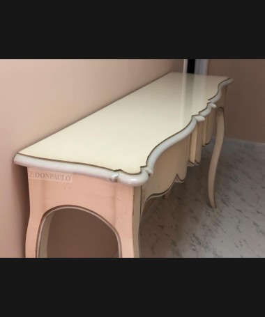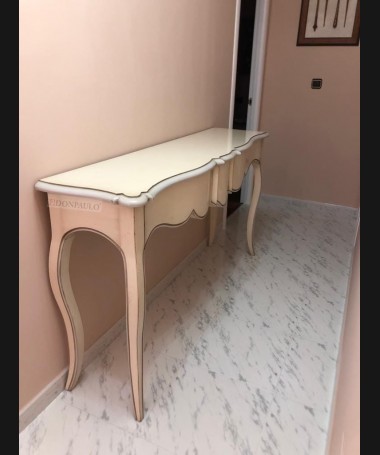 - Consola modelo TAP0066, de estilo clásico hecha a medida, en madera de cerezo en acabado efecto anticuario blanco con detalles en gris envejecido. Con tres cajones