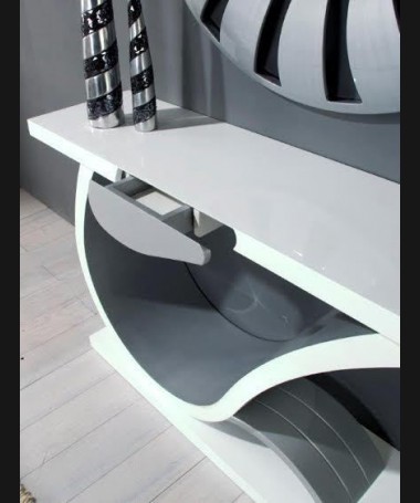 - Consola modelo PAP0004, hecha a medida de estilo moderno, lacada en blanco y gris alto brillo con un cajón y espejo a juego