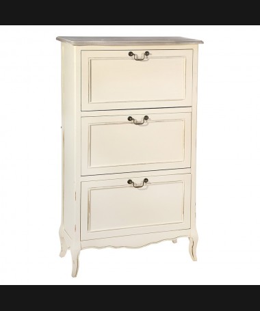 - Zapatero modelo PAP0005, de estilo clásico hecho a medida, en madera de cerezo en acabado blanco roto efecto anticuario, con 3 cajones abatibles para guardar zapatos