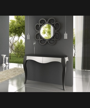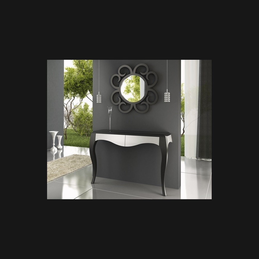 - Consola modelo PAP0010, de estilo moderno hecha a medida, en lacado negro y gris mate, con dos cajones y espejo a juego