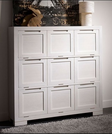 - Zapatero modelo PAP0024, de estilo moderno hecho a medida, en madera, en acabado decapado blanco roto con tiradores de uñero y cajones abatibles para guardar los zapatos