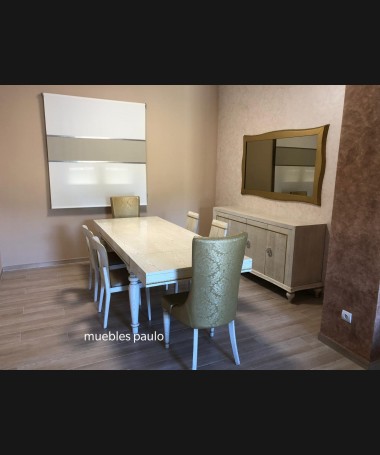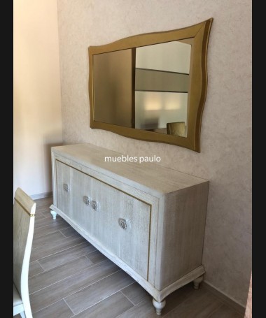 - Aparador con espejo modelo TAP0002, en madera de castaño en acabado decape blanco, con detalles y la beta dorada, hecho a medida