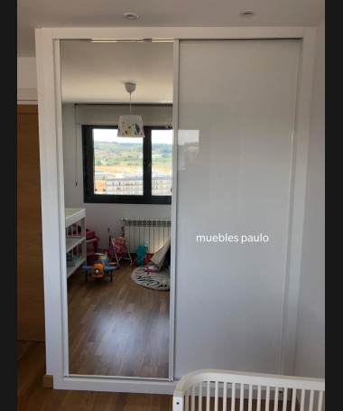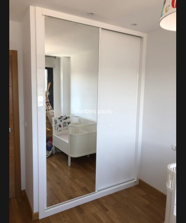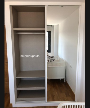 - Armario modelo TAR0060, de estilo moderno hecho a medida, en blanco con el interior en melamina textil, con la distribución personalizada, de puertas correderas con un espejo