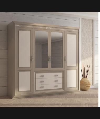 - Armario modelo PAR0035, de estilo moderno hecho a medida, con las puertas de apertura y los cajones exteriores, lacado en blanco y color camel, con dos espejos en las puertas centrales. Con el interior personalizado