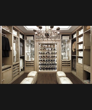 - Vestidor modelo PAR0060, de estilo clásico hecho a medida, con puffs tapizados, en color madera clarito con luces led y la distribución personalizada