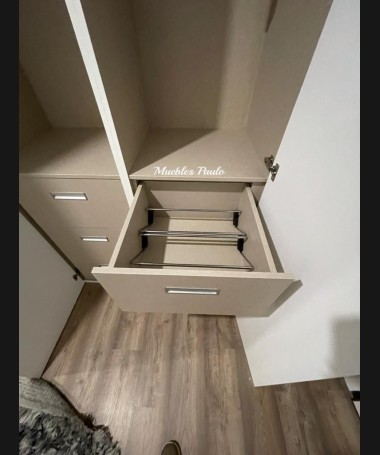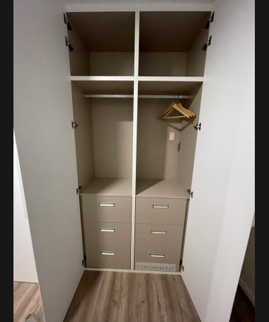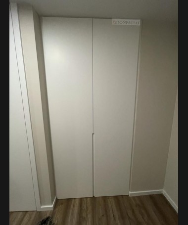 - Armario modelo TAR0068, de estilo moderno hecho a medida, con dos puertas de apertura. Lacado en blanco mate, con el interior de melamina textil personalizado