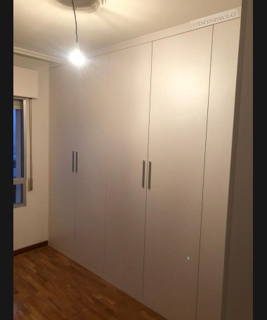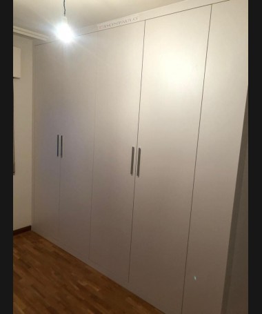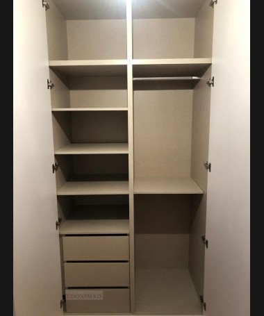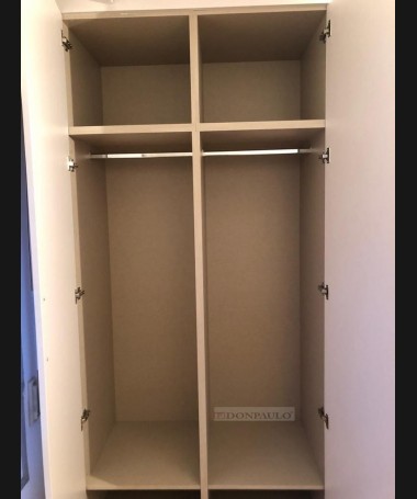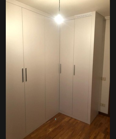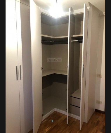 - Armario modelo TAR0074, de estilo moderno hecho a medida, en forma de "L", en acabado blanco, con el interior en melamina textil