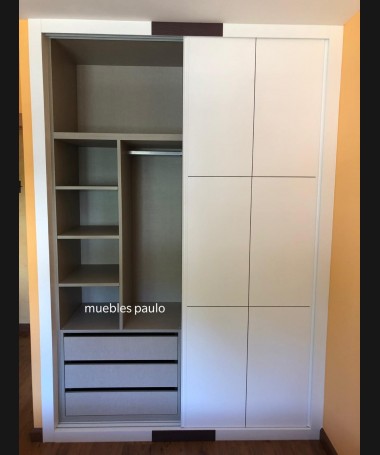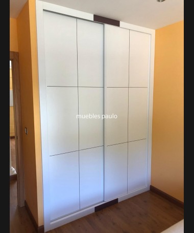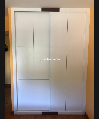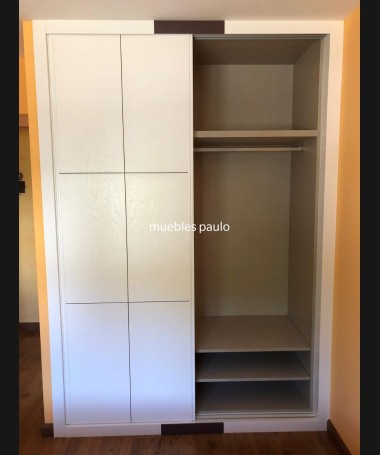 - Armario modelo TAR0077, de estilo moderno hecho a medida, en madera en decapado blanco, con detalles color negro. Con el interior de melamina textil con la distribución personalizada