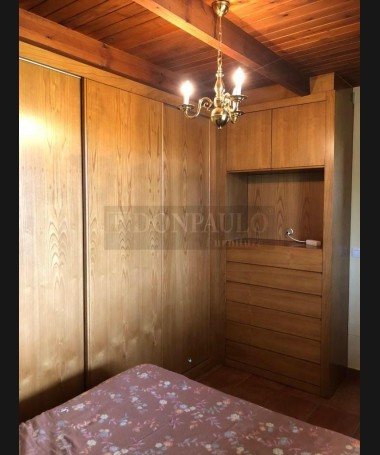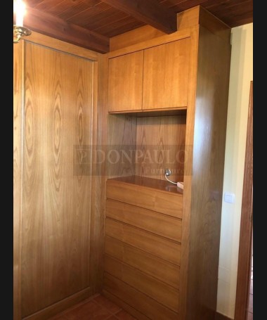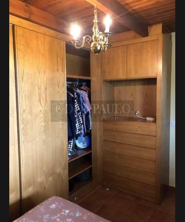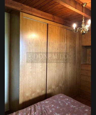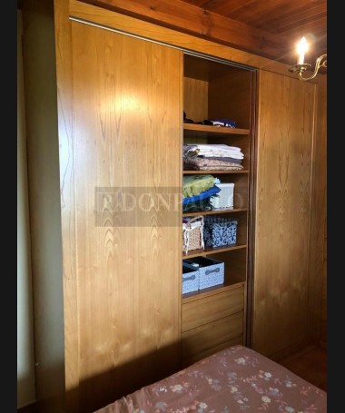 - Armario modelo TAR0096, de estilo rústico hecho a medida bajo-cubierta, fabricado en madera de castaño en acabado color alemán, con el interior personalizado, con hueco para la televisión y puertas correderas.
