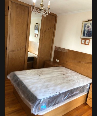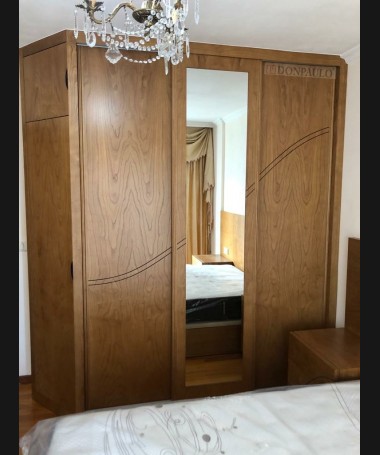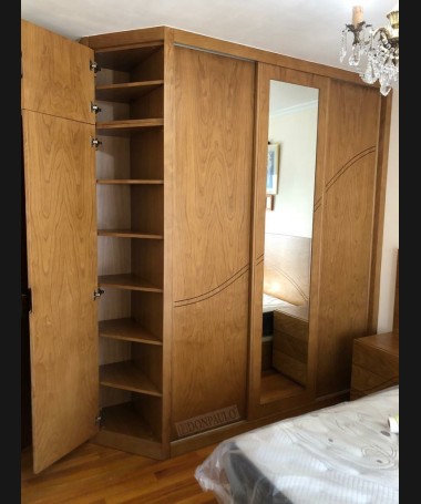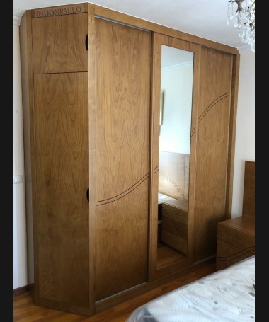 - Armario modelo TAR0005, de estilo moderno hecho a medida, en madera de castaño en acabado color roble, con tres puertas correderas y una de apertura, con el interior a juego y personalizado y la esquina en chaflán.