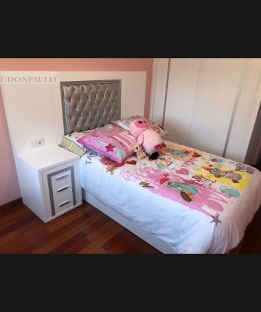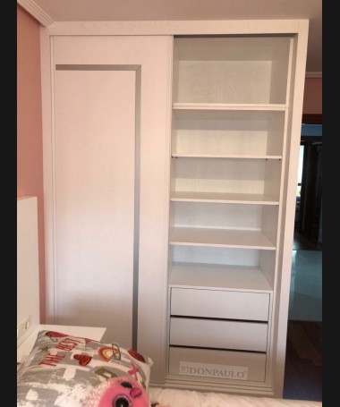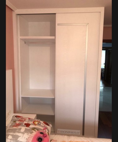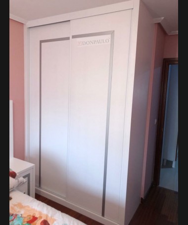 - Armario modelo TAR0106, de estilo moderno hecho a medida, en madera en acabado decapado blanco con un detalle plateado. Con las puertas correderas y el interior personalizado.