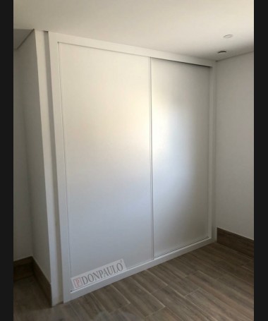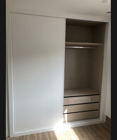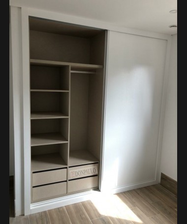 - Armario modelo TAR0113, de estilo moderno hecho a medida en madera en acabado decapado blanco, con el interior personalizado en melamina textil.