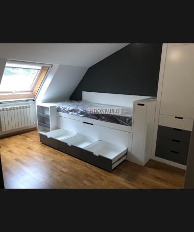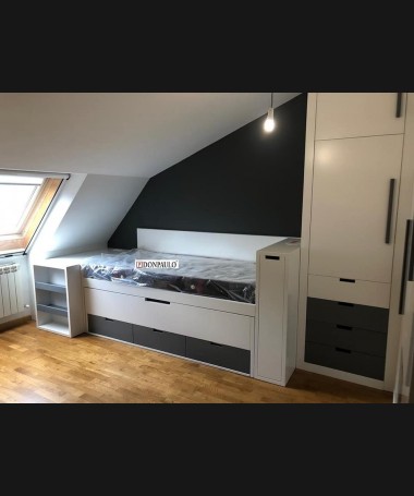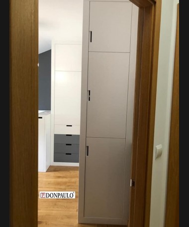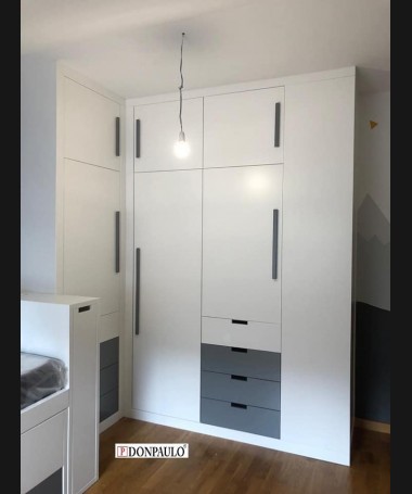 - Armario modelo TAR0114, de estilo moderno hecho a medida, fabricado en dm hidrófugo lacado en blanco mate, con detalles lacados en gris antracita. Con puertas de apertura y en forma de "L".