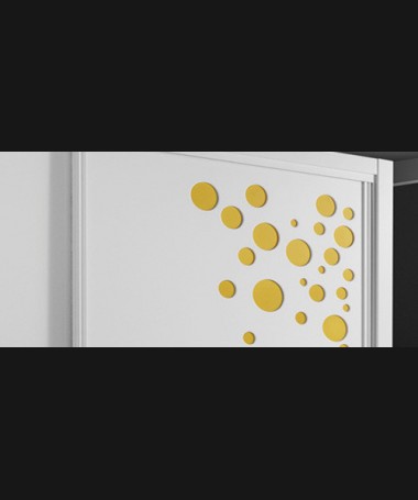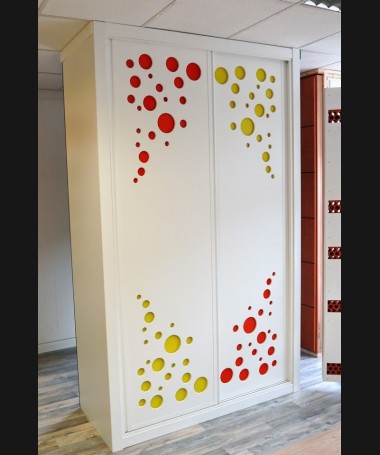 - Armario modelo PAR0011, de estilo moderno hecho a medida, lacado en blanco mate, con detalles circulares en rojo y amarillo, con el interior personalizado y de puertas correderas