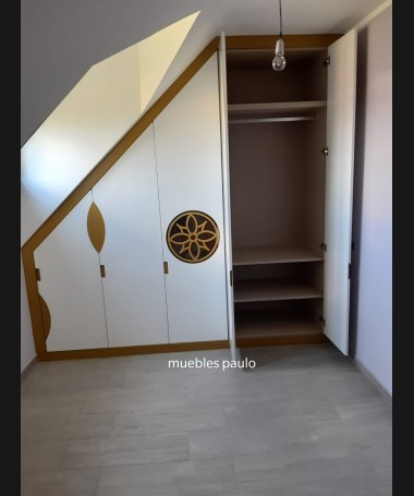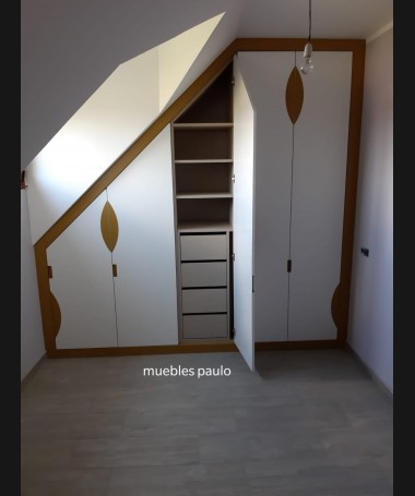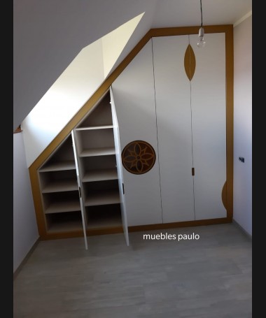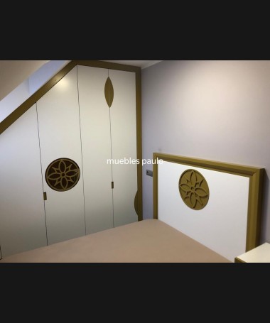- Armario modelo TAR011, armario bajo-cubierta hecho a medida en madera en acabado decape blanco, con detalles dorados, y el interior personalizado hecho de melamina