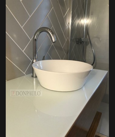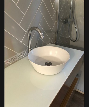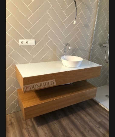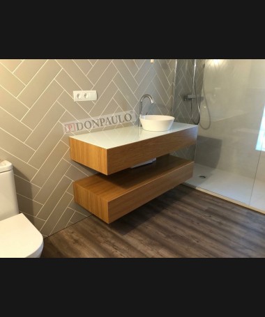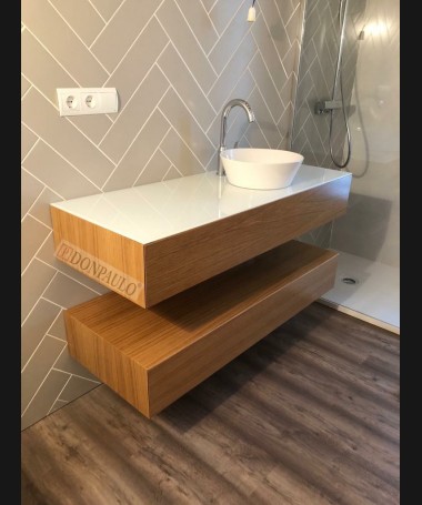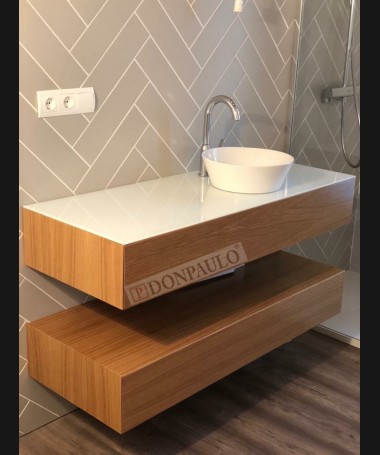 - Mueble de baño modelo TBA0005, de estilo moderno hecho a medida, en tablero marino color roble con la encimera de cristal blanco y dos cajones