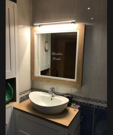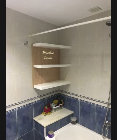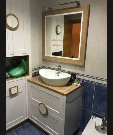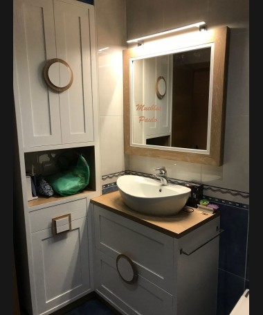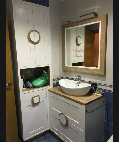 - Mueble de baño modelo TBA0016, de estilo moderno hecho a medida, en tablero marino y decapado blanco, con cajones y puertas y baldas en la ducha
