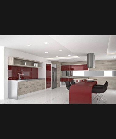 - Cocina modelo PCC0042, de estilo moderno hecha a medida, en madera, y lacada en alto brillo granate