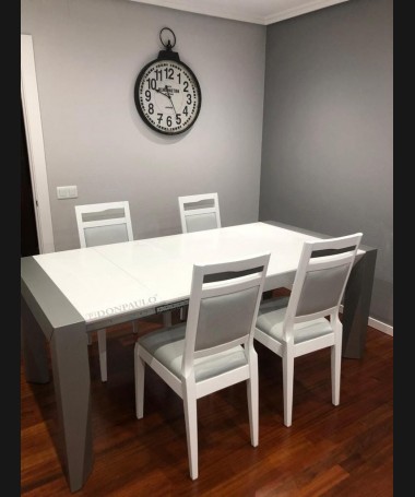 - Comedor modelo TCO0020, de estilo moderno hecho a medida, en madera en acabado decapado blanco con los detalles grises, compuesto por mesa extensible de apertura con la pata, y 4 sillas tapizadas en tela de microfibras de fácil limpieza