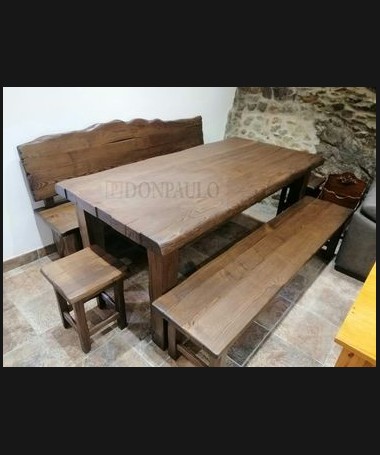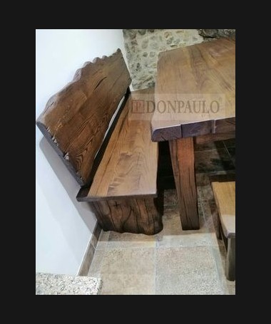 - Comedor modelo TCO0024, de estilo rústico hecho a medida, en madera de castaño macizo en acabado envejecido, compuesto por mesa de comedor, escaño con respaldo, banco sin respaldo, banqueta y vitrina a juego