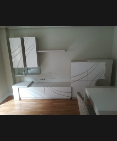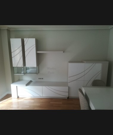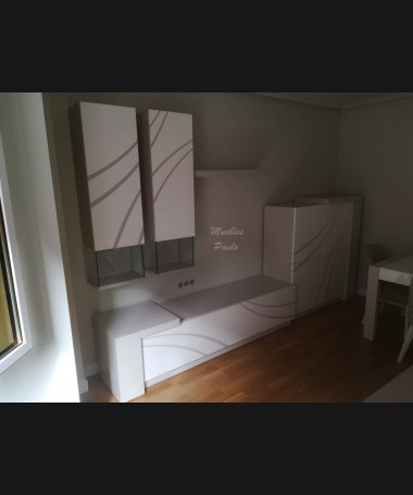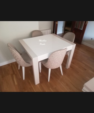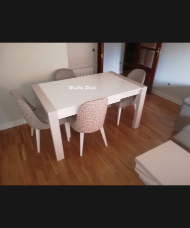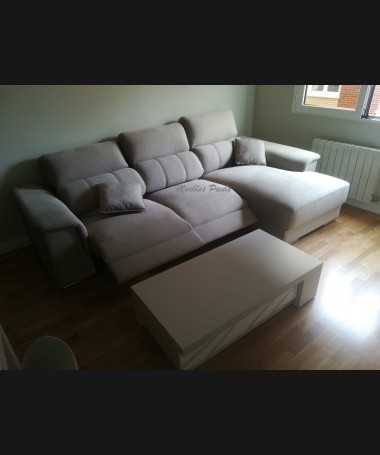 - Comedor modelo TCO0036, de estilo moderno hecho a medida, en madera en acabado decapado blanco y gris, compuesto por mesa de comedor extensible, 4 sillas tapizadas en tela de fácil limpieza, mueble de salón, mesa de centro a juego, y chaisselonge con asiento relax electrico