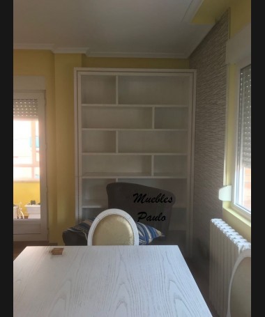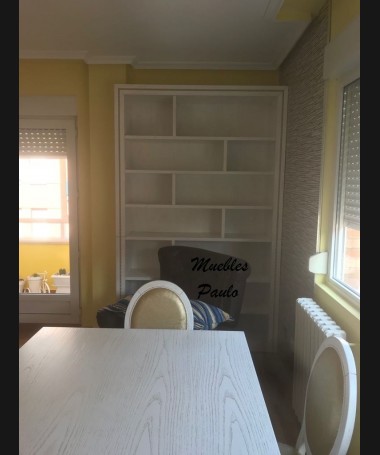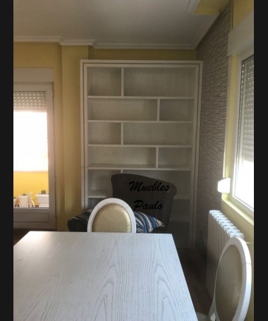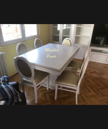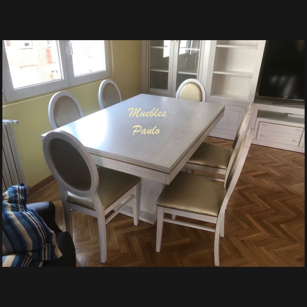 - Comedor modelo TCO0038, de estilo moderno hecho a medida, en madera en acabado decapado blanco con la beta dorada, y los detalles dorados. Compuesto por: mueble de salón, mesa de centro a juego, mesa de comedor extensible, 6 sillas tapizadas en polipiel dorada, librería a juego y rinconera hecha a medida