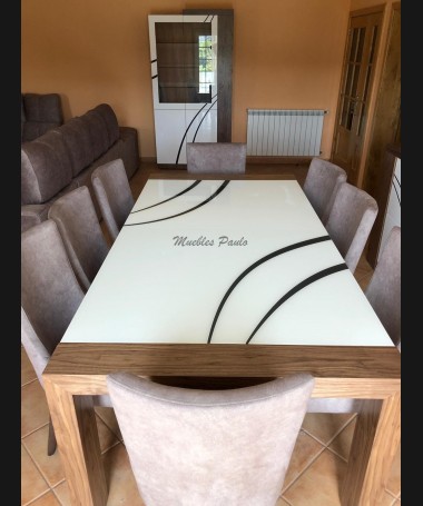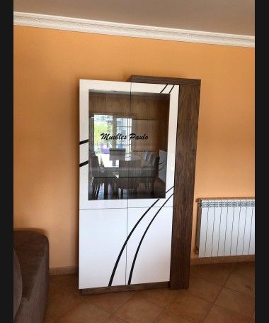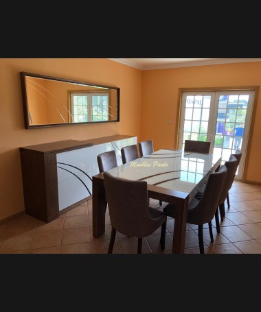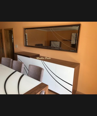 - Comedor modelo TCO0039, de estilo moderno hecho a medida, en madera de nogal y lacado blanco brillo. Compuesto por mesa de comedor extensible, 8 sillas tapizadas en tela de microfibras de fácil limpieza, aparador con espejo a juego, Vitrina, mueble de salon, con mesa de centro a juego, y sofá rinconera con chaisselonge