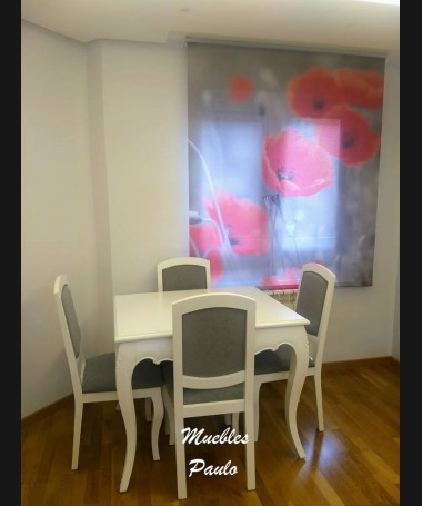 - Comedor modelo TCO0045, de estilo moderno hecho a medida, en acabado lacado blanco mate, con las 4 sillas a juego tapizadas en tela gris de fácil limpieza