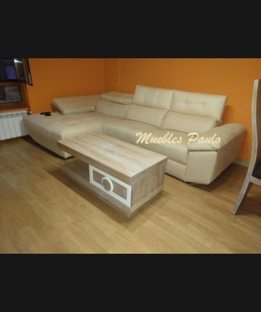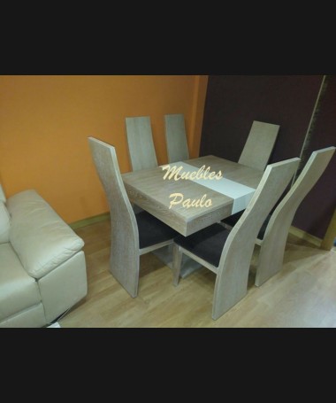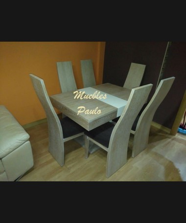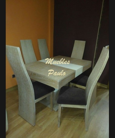 - Comedor modelo TCO0047, de estilo moderno hecho a medida, en madera de roble acabado roble blanchi, con detalles decape beige. Compuesto por mesa de comedor extensible, 6 sillas tapizadas en tela de fácil limpieza, mueble de salón, mesa de centro a juego y chaisselonge