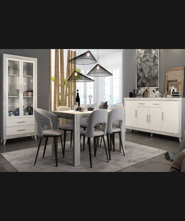 - Comedor modelo PCO0022, de estilo moderno hecho a medida, en lacado blanco y madera decapada en gris. Compuesto por: mesa de comedor extensible, sillas tapizadas, aparador y vitrina a juego