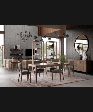 - Comedor modelo PCO0028, de estilo moderno hecho a medida, compuesto por mesa de comedor, sillas tapizadas, aparador, espejo y estanterías a juego