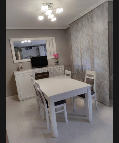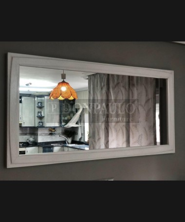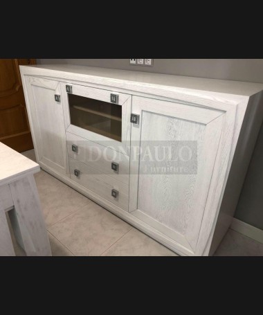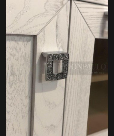 - Comedor modelo TCO0050, de estilo moderno hecho a medida, en madera en acabado decapado blanco con detalles plateados. Compuesto por aparador con espejo, mesa de comedor extensible y sillas