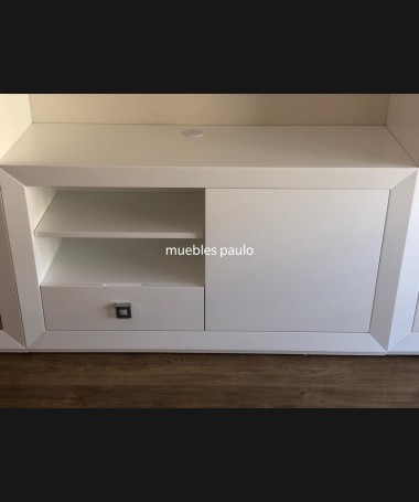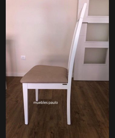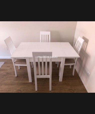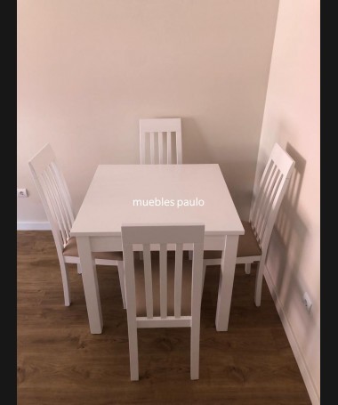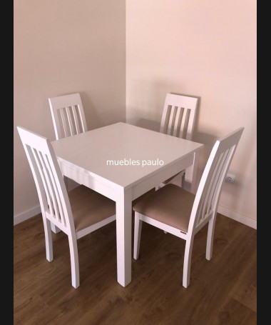 - Comedor modelo TCO0006, en DM hodrófugo lacado en blanco y marrón, hecho a medida, compuesto por mesa cuadrada extensible, 4 sillas, consola, mueble de salón y mesa de centro a juego