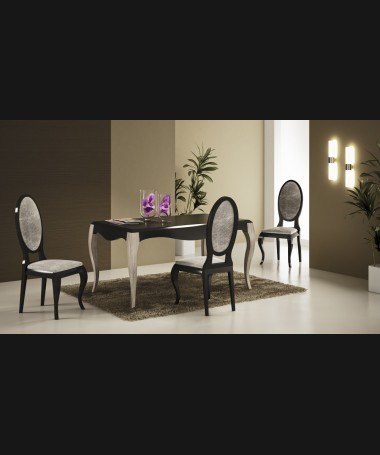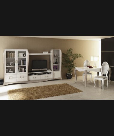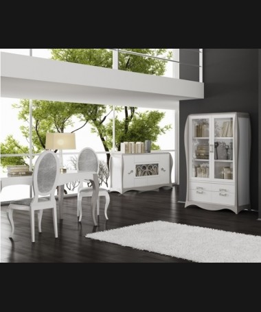- Comedor modelo PCO0010, de estilo moderno hecho a medida, en lacado blanco y gris, compuesto por mesa, sillas, vitrina y aparador a juego