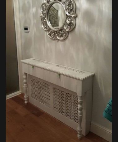 - Cubre-radiador modelo PCU0007, de estilo clásico hecho a medida, en lacado blanco mate con las patas torneadas y dos cajones