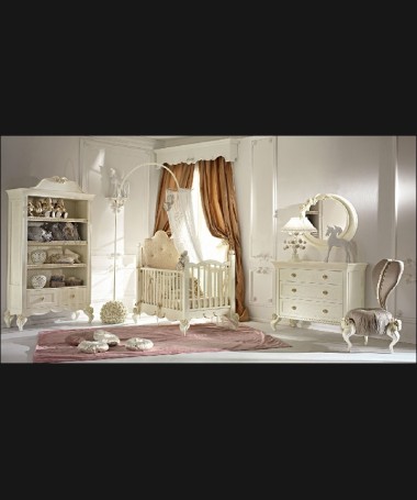- Dormitorio de bebé modelo PDB0021, de estilo clásico hecho a medida, lacado en blanco roto. Compuesto por cuna, cambiador con espejo, estantería y silla a juego