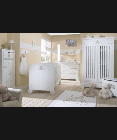 - Dormitorio de bebé modelo PDB0022, de estilo moderno hecho a medida, lacado en blanco mate con detalles color camel. Compuesto por cuna, cambiador, sinfonier y armario a juego