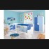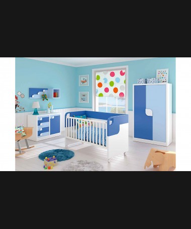 - Dormitorio de bebé modelo PDB0002, de estilo moderno hecho a medida, lacado en blanco y dos tonos de azul, compuesto por cuna, armario, cómoda y estantería con perchero a juego
